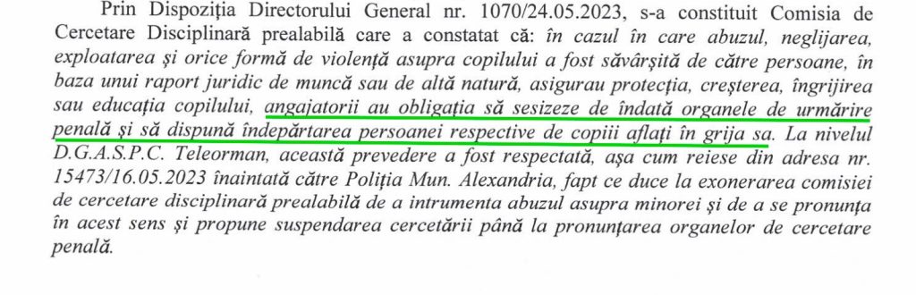 Tot în răspunsul DGASPC se mai spune că, dacă abuzul este săvârșit de o persoană care asigură protecția și îngrijirea copilului, „angajatorii au obligaţia să sesizeze de îndată organele de urmărire penală şi să dispună îndepărtarea persoanei respective de copiii aflaţi în grija sa”.