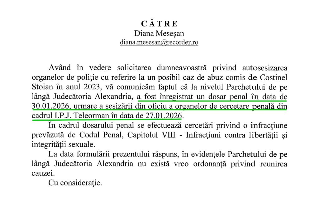 La câteva zile după ce reporterii Recorder au mers la sediul Inspectoratului de Poliție Județean (IPJ) Teleorman și au revenit cu solicitări telefonice, IPJ Teleorman s-a autosesizat în cazul din mai 2023 și a înaintat o plângere către Parchetul de pe lângă Judecătoria Alexandria, deși faptele nu fuseseră considerate penale la momentul respectiv.