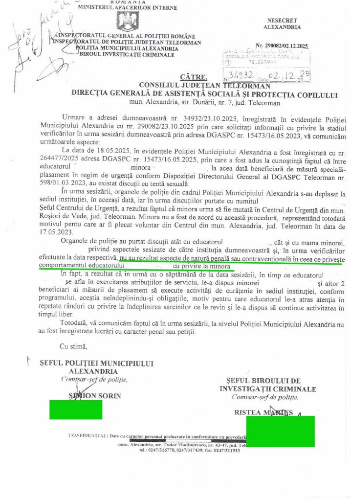 Pe 2 decembrie 2025, Poliția Teleorman îi răspunde că, „în urma verificărilor efectuate la data respectivă, nu au rezultat aspecte de natură penală sau contravențională în ceea ce priveşte comportamentul educatorului cu privire la minoră”.