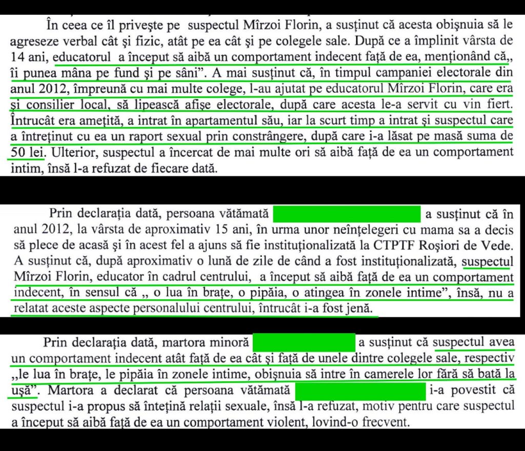 Șase fete care au fost în centrul din Roșiori au declarat că educatorul intra peste ele în cameră, le atingea in zonele intime, le săruta și avea un comportament indecent față de ele. Două dintre persoanele vătămate au declarat, în plus, că Mîrzoi a întreținut relații sexuale cu ele prin constrângere.