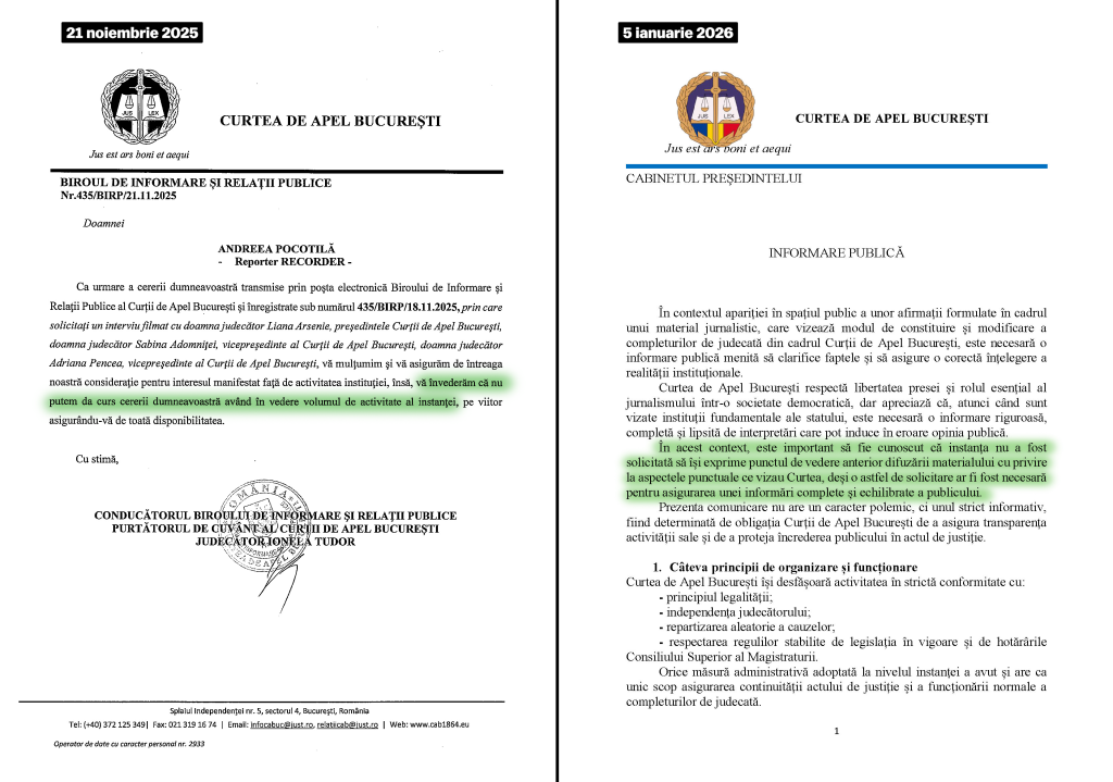 Toate cele trei solicitări de interviu pe care le-am trimis către conducerea Curții de Apel București în noiembrie 2025 au fost refuzate, iar dovada este mai jos. Comunicatul de ieri, în care se afirmă că „instanța nu a fost solicitată să își exprime punctul de vedere”, este semnat de președinta Curții de Apel București, Liana Arsenie, adică una dintre cele trei judecătoare care au refuzat interviul.