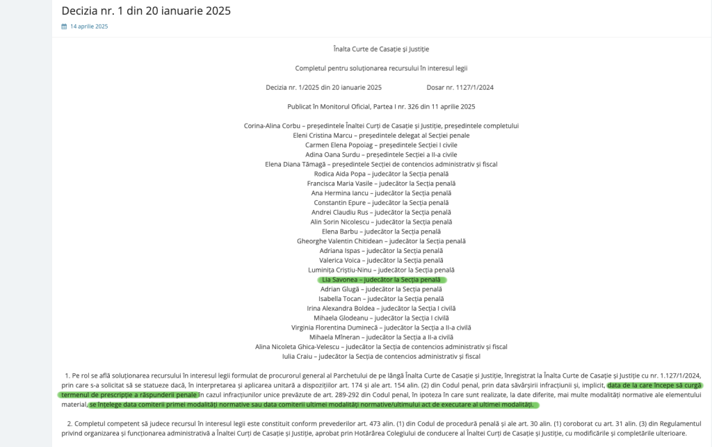 Din completul care a luat această decizie a făcut parte și Lia Savonea, actuala președintă a Înaltei Curți. Mai mulți magistrați cu care am stat de vorbă caracterizează această decizie drept una care „reinventează dreptul” și care e luată direct în beneficiul infractorilor. De ce? Pentru că în baza acestei decizii se poate ajunge la situația absurdă în care procurorii pot prinde în flagrant pe cineva care ia șpagă, dar fapta este deja prescrisă.