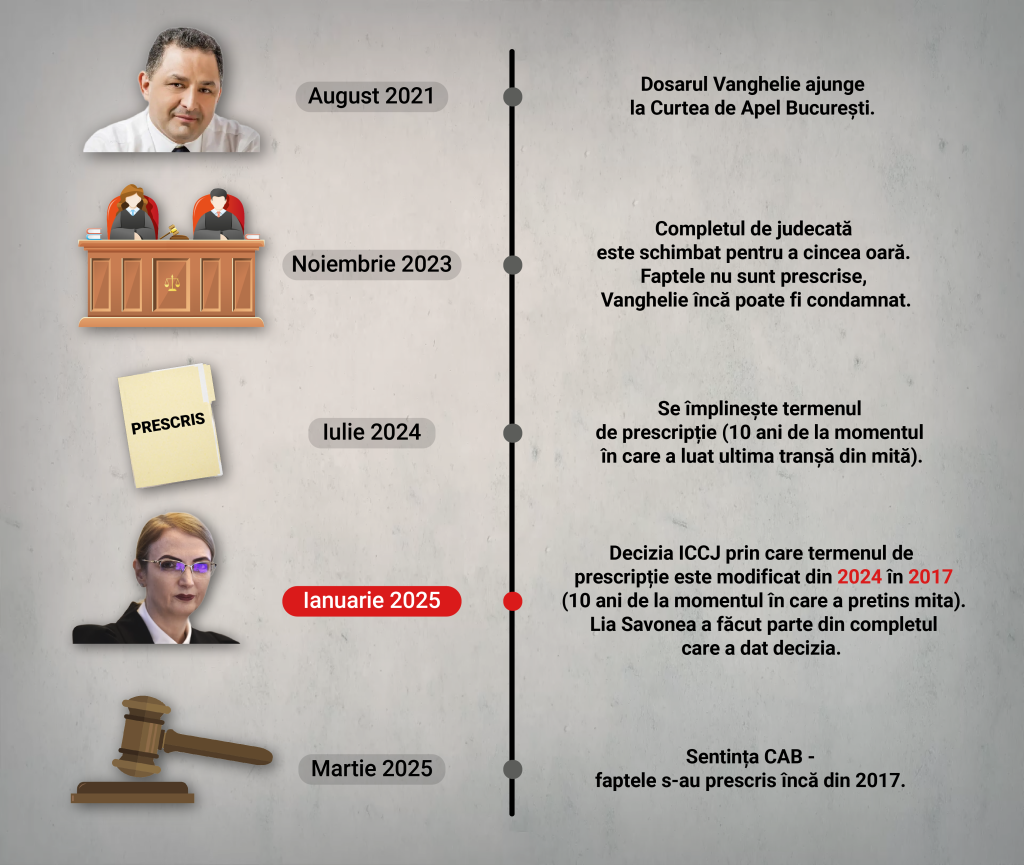 E important să spunem câteva cuvinte și despre decizia Înaltei Curți din ianuarie 2025, care a stabilit că prescripția în cazul infracțiunilor de luare de mită începe să curgă de la momentul în care inculpatul a pretins mita (2007 în cazul Vanghelie), nu de la momentul în care a luat ultima tranșă din mită (2014 în cazul Vanghelie).